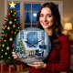 This touching memorial clock features a deep blue velvet armchair next to a decorated Christmas tree in a room with wood flooring, looking out a large window onto a snowy night. The face is adorned with a comforting poem about loved ones in heaven: "Christmas In Heaven... save them a seat, just one empty chair." The empty chair symbolizes remembrance. The design may look real due to the high detail and three-dimensional texture in the artwork.