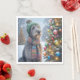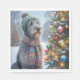 An einem schneebedeckten Tag steht ein irischer Wolfhound mit einem Strickhut und farbenfrohen Schal neben einem dekorierten Weihnachtsbaum