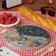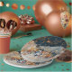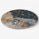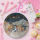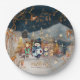 Schöne Weihnachtsschneeberge und dunkelblauer Himmel auf Party Papier Teller mit süße Figuren und Goldelementen. Die Eichhörnchen, Snowman, ein Mädchen und ein Baby, ein Fuchs, Mäuse, eine Eule, Raben und ein kleiner Vogel werden den richtigen Weihnachtsgeist hervorbringen. Große Tischdekoration für das Party/die Ansammlung