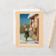 Entworfen von Susan Epps Oliver. Vintage-Bild eines kleinen Mädchens mit einem grünen Mantel und einem rosa Hut, der dem Weihnachtsmann seine Weihnachtsliste zuschickt. Der Weihnachtsmann beobachtet sie von innen im Postamt.