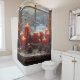 Pretty shower curtain with a view outside at the Winter landscape, perfect to dress up your bath for Christmas. Beautiful bright red, lit candles on a window sill with pine cones, snow and red berries.