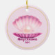 Dieses Keramik-Ornament mit einer hübschen dekorativen Muschel in Pflaume und Rosa-Tönen mit einem Bild einer glänzenden Perle im Inneren gezeigt. Der individuell anpassbare Text von "Frohe Weihnachten 2025" ist in Pflaumenfarbe. Hat eine goldene Farbgrenze. Bilder werden auf Vorder- und Rückseite gedruckt. Denken Sie daran, beide Seiten dieses Ornaments anzupassen, wenn Sie es anpassen. Passen Sie dieses Element mit dieser Vorlage an oder kaufen Sie es wie gezeigt. Lizenziertes Bild
