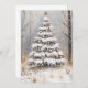 A snow dusted evergreen Christmas card, decorated with silver ornaments in a quiet winter landscape. Bare trees and falling snow frame the scene in soft neutral tones. The back of the card includes the message Wishing you peace, joy, and happiness this holiday season, along with space to personalize your name or signature.