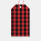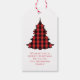 This design features a Christmas holiday red cute simple gift tag, with Merry Christmas red and white text and winter farm style Christmas tree, a classic buffalo plaid check, a classic black and red pattern, a minimalist calligraphy typography script, modern calligraphy script font, a calligraphy merry Christmas, a classy country farmhouse simple Xmas, a Christmas holiday gift favor tag, a Christmas gift wrap wrapping supplies