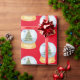 Feierliche Weihnachtsgeschenk-Wrap zeigt Muster von Aquarellschnee-Kugeln mit Weihnachtsbaum auf rotem Hintergrund.