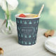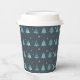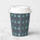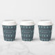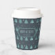 This paper cup features a pattern of stylized Christmas trees and snowflakes in shades of watchet blue on a dark teal blue background. Optional 'Happy Holidays' text and a label have been provided to add your name and/or other text. Search ID861 thru ID864 to see additional color options and other products in this modern, Christmas design set.