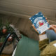 Blue and white Christmas trees and snowflakes and red and gold Christmas presents