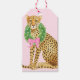 This Christmas gift tag has a Leopard wearing a wreath with a pink bow.
