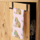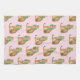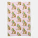 This Christmas table cloth has a Leopard wearing a wreath with a pink bow on a pink background.