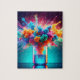 The image depicts a vibrant explosion of color erupting from a laboratory beaker. Clouds of pink, orange, blue, and green ink billow upwards, capturing the energy of a chemical reaction frozen in time. The beaker, filled with a glowing blue liquid, sits on a reflective surface, hinting at the transformative power contained within. The dark background and strategic lighting further emphasize the brilliance of the colors, creating a sense of wonder and excitement.