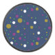 Ein Muster von Kreise unterschiedlicher Größe in Gold, Weiß, lila und Grün ist auf einem dunkelblauen Hintergrund verstreut. Die Kreise sind gleichmäßig verteilt und variieren im Durchmesser.