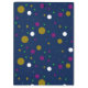 Ein Muster von Kreise unterschiedlicher Größe in Gold, Weiß, lila und Grün ist auf einem dunkelblauen Hintergrund verstreut. Die Kreise sind gleichmäßig verteilt und variieren im Durchmesser.