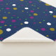 Ein Muster von Kreise unterschiedlicher Größe in Gold, Weiß, lila und Grün ist auf einem dunkelblauen Hintergrund verstreut. Die Kreise sind gleichmäßig verteilt und variieren im Durchmesser.