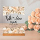 Joli panneau de douche à nuptiale en acrylique clair avec "Fall in Love!" et vos détails en lettrage chic avec pêche élégante, terre cuite pâle, oranges rustiques et fleurs grises. MODIFIEZ LA TAILLE pour adapter votre événement et commander avec ou sans support en bois. CORRESPONDANCE d'objets dans notre collection.