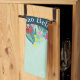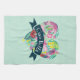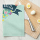 Ein Küchentuch mit individualisierbarem Text, in dem steht: "Ciao Bella", in gebogenem Text in einem blau-grünen Band geschrieben, das über einem skurrilen Herz mit tropischen Blume und Blätter in Rosa, Grün und Gelb liegt. Der Hintergrund ist ein helles Aqua-Grün mit einem Damast-Muster. Klänglich und skurril.
