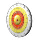 Quatre cercles sont centrés sur un arrière - plan blanc. L'orbe rouge centrale est plus petite, l'autre est un cercle 3d jaune solide, l'autre est une boule rouge translucide plus grande. Ensuite est la plus grande bague colorée de jaune, baguée par l'arrière - plan blanc