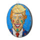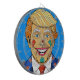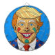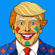 Un caricaturiste aux cheveux blonds avec un visage clown souriant en costume.