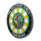 Une représentation circulaire d'un orignal aux bois, entouré d'arbres et d'une couverture cible