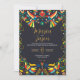 Dieses farbenfrohe mexikanische Cinco de Mayo Fiesta Wedding Invitation Design präsentiert ein lebendiges mexikanisches Folk Art inspiriert Thema mit bunten Vögeln, Blume und einem zentralen Herzmotiv. Die hellen Rot-, Gelb-, Blau- und Grüntöne heben sich von der schwarzen Hintergrundfarbe ab und sorgen für ein festliches und lebendiges Ambiente. Die symmetrische Anordnung der Vögel und Blume verleiht Ausgeglichenheit und Harmonie, ideal für Hochzeitseinladungen oder Feierlichkeiten.