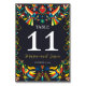 Dieses farbenfrohe mexikanische Cinco de Mayo Fiesta Wedding Tischnummer Design präsentiert ein lebendiges mexikanisches Folk Art inspiriert Thema mit bunten Vögeln, Blume und einem zentralen Herzmotiv. Die hellen Rot-, Gelb-, Blau- und Grüntöne heben sich von der schwarzen Hintergrundfarbe ab und sorgen für ein festliches und lebendiges Ambiente. Die symmetrische Anordnung der Vögel und Blume verleiht Ausgeglichenheit und Harmonie, ideal für Hochzeitseinladungen oder Feierlichkeiten.