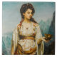 Abstellende, reich verzierte Gemälde aus dem 19. Jahrhundert, die eine anmutige Frau in traditioneller Kleidung darstellen und eine Tasse mit gediegener Eleganz halten. Die verzierten Textilien, die gebirgige Kulisse und die klassische Öltechnik machen dieses Kunstwerk zu einem zeitlosen kulturellen und künstlerischen Ausdruck. Ideal für Liebhaber Vintager Porträts, klassischer Kunst und historischer Dekoration. Ideal für Wanddrucke und elegante Zuhause-Akzente.