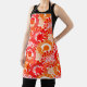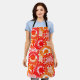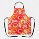 Diese Schürze hat ein Kreisbild, das mit Linien und Kreisen aus wiederholten Punkten in Rot und Orange dekoriert ist.