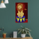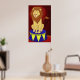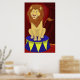Ein Plakatdruck mit einer Darstellung eines Zirkuslions, der auf einem blau-gelben Podium sitzt. Er wird von einem Scheinwerfer beleuchtet, und hinter ihm steht ein schöner roter Vorhang mit Goldschnitt. Dieses Cartoon-Poster im Zirkus würde Kindern, großen Katzenliebhabern und Menschen, die den Zirkus Liebe haben, ein großartiges Geschenk machen.