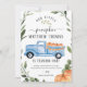 Superbe verdure avec invitation citrouille avec un camion bleu rempli de citrouilles.