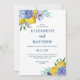 Diese moderne Zitronenhochzeit lädt zu einer Hochzeit im Frühling oder Sommer ein. Dieses elegante Design besticht durch helle und schöne Aquarellfarben mit eleganten blauen Blumen und Grünpflanzen. Ein gelbes und weißes Muster schmückt die Rückseite der Einladung. Entworfen für Sie von BlackBerry Boulevard.