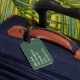 Ein karierter Gepäckanhänger im bunten, schottischen Clan Bisset Tartan Muster. Ein grüner Textbereich, in der Mitte, hat ein Monogramm mit weißem Single und einen schwarzen Namen, der für die Personalisierung bereit ist. Die Rückseite des Tags ist grün, der Informationstext ist weiß.