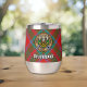 Clan Drummond Wappen Abzeichen umgeben von einem Gurt und Schnallen über Tartan Hintergrund. Benutzerdefinierter Text auf beiden Seiten.