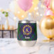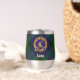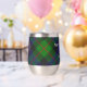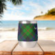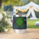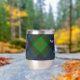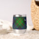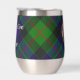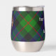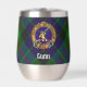 Clan Gunn Wappen Abzeichen umgeben von einem Gurt und Schnalle über Tartan Hintergrund. Benutzerdefinierter Text auf beiden Seiten.
