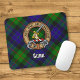 Clan Gunn Wappen Abzeichen umgeben von einem Gurt und Schnalle über Tartan Hintergrund. Eigener Text.