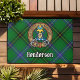 Clan Henderson Wappen Abzeichen umgeben von einem Gurt und Schnalle über Tartan Hintergrund. Eigener Text.