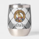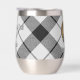 Clan MacFarlane Wappen Abzeichen umgeben von einem Gurt und Schnallen über schwarz-weiß Tartan Hintergrund. Benutzerdefinierter Text auf beiden Seiten.