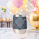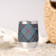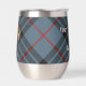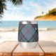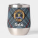 Clan MacKay crête badge entouré d'une sangle et boucle sur l'arrière - plan tartan bleu. Texte personnalisé des deux côtés.