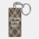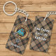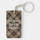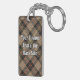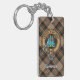 Clan MacKenzie badge de crête entouré d'une courroie et boucle sur un arrière - plan tartan brun de chasse. Texte personnalisé des deux côtés.