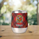 Clan Wallace Wappen Abzeichen umgeben von einem Gurt und Schnalle über Tartan Hintergrund. Benutzerdefinierter Text auf beiden Seiten.