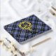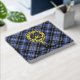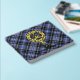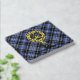 Clan Clark Wappen Abzeichen umgeben von einem Gurt und Schnalle über Tartan Hintergrund. Benutzerdefinierter Vorder-, Rücken- und Rückentext.