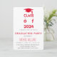 NewParkLane - Graduation Party Invitation, avec 'Class of 2024' en typographie rouge, avec des lettres suspendues, et une casquette de graduation rouge. L'arrière est bleu et a un motif de petites bouchons blancs de graduation. Version 2024 disponible sur demande