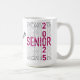 Ce design personnalisé de tasse comporte le mot "SENIOR" répété plusieurs fois dans une police de contour noir et audacieuse. Les numéros "2" et "5" sont entrecoupés dans le mot "SENIOR" dans une couleur rose vif et brillante. Le "SENIOR" central est rempli du même motif rose étincelant, et l'expression "classe de" est élégamment scénarisée à travers elle en blanc. Ce design célèbre la remise des diplômes de 2025 avec un look élégant et attrayant, parfait pour commémorer ce jalon spécial.