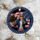 • This classic round ceramic ornament features a striking digital illustration of bold American symbols in vivid red white and blue. It makes a thoughtful, long-lasting keepsake perfect for any patriotic holiday or occasion throughout the year.