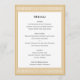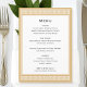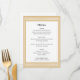 Créez vos propres menus de table personnalisés pour un événement spécial. La typographie classique et une frontière grecque ajoutent une élégance intemporelle à votre célébration — un motif géométrique, labyrinthique, inspiré de l'art grec et romain antique. Ce modèle modifiable vous permet de customiser le texte pour convenir parfaitement à vos plats ou à vos plats. Idéal pour un dîner formel, un déjeuner élégant, un brunch, un anniversaire, un mariage ou tout autre événement. Couleurs imprimées : or et blanc, avec lettrage gris foncé.