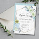 Célébrez avec vos amis proches à votre douche nuptiale et les invitations avec cette belle invitation à la douche nuptiale à fleurs bleues. Ce design présente un beau cadre géométrique doré avec des bouquets de fleurs d'aquarelle douce avec des roses et des hydrangées en bleu et blanc cassé. Délicate garniture botanique avec feuilles bleus complète parfaitement ce bel invitation de douche nuptiale.
