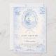 A classic powder-blue toile design inspired by traditional French countryside prints. Vintage nursery motifs — pram, rocking horse, lamb, pastoral village scenes and delicate ornamental borders — frame a clean, structured central layout. The soft ivory background paired with refined blue linework creates a timeless and sophisticated look. Perfect for a traditional baby shower with an elegant European aesthetic.