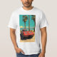 A vibrant, painterly illustration of a classic red Chevrolet Corvette Stingray parked on a sunny beachfront. The car is framed by tall palm trees in the foreground, with a calm turquoise ocean, distant sailboats, and hazy mountains under a bright blue sky in the background, evoking a relaxed, retro coastal vacation vibe.