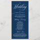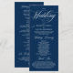 Elegante Vintage Klassik Marine Blue Drehbuch, Hochzeitsfeier Programm in Karte (lang). Es ist mit Scrollakzent entworfen, der personalisiert werden kann mit benutzerdefiniertem/personalisiertem Text für Ihr Brautparty, Zeremonie Details, Gedenkhinweise und Dankeschön-Nachricht.