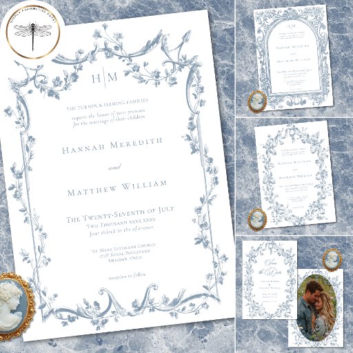 Announce your special day with an elegant traditional wedding invitation featuring a delicate, vintage-style border of florals and ribbons in soft dusty blue. Perfect for a formal ceremony or an affair with a classic, timeless aesthetic. This refined design offers an opulent look. Created by Simply Farmhouse Press.