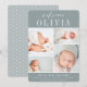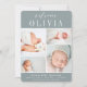 Elegante Geburtenankündigungen zeigen vier neu geborene Fotos, die in einer Rasterkollage auf staubgrünem Hintergrund angeordnet sind. "Welcome [name]" erscheint oben in der schicken Kalligraphie-Schrift und klassischen Blockschrift. Personalisieren Sie das Baby mit dem vollständigen Namen, den Geburtsstatistiken und einer Familiensignatur unten. Ein einfaches und sauberes, geschlechtsneutrales Design für die Ankündigung der Ankunft Ihres Kleinen.