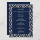 Un arrière - plan classique en sangliers de marine et taupe constituent la base de ce menu personnalisé traditionnel mais moderne et élégant de réception de mariage. Un insert bleu marine contient les informations pertinentes personnalisables sur le mariage.